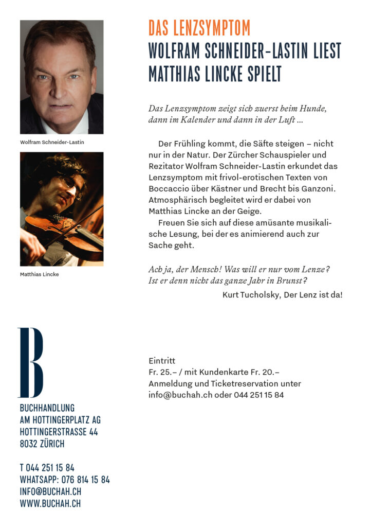 Der Frühling kommt, die Säfte steigen – nicht nur in der Natur. Der Zürcher Schauspieler und Rezitator Wolfram Schneider-Lastin erkundet das Lenzsymptom mit frivol-erotischen Texten von Boccaccio über Kästner und Brecht bis Ganzoni.